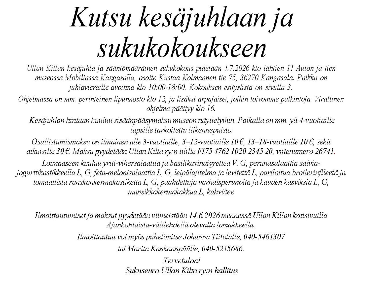 Etusivu > Ullan Kilta ry:n sukujuhlat Mobiliassa Kangasalla 4.7.2026